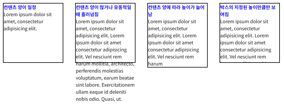 웹페이지에서 기본 구조를 만드는 박스들은 대부분 높이가 고정되어 있고 게시판, 뉴스 페이지 등 어떤 박스들은 내용에 따라 박스 높이가 바뀔 수 있다. 이런 경우 overflow 속성을 사용한다.