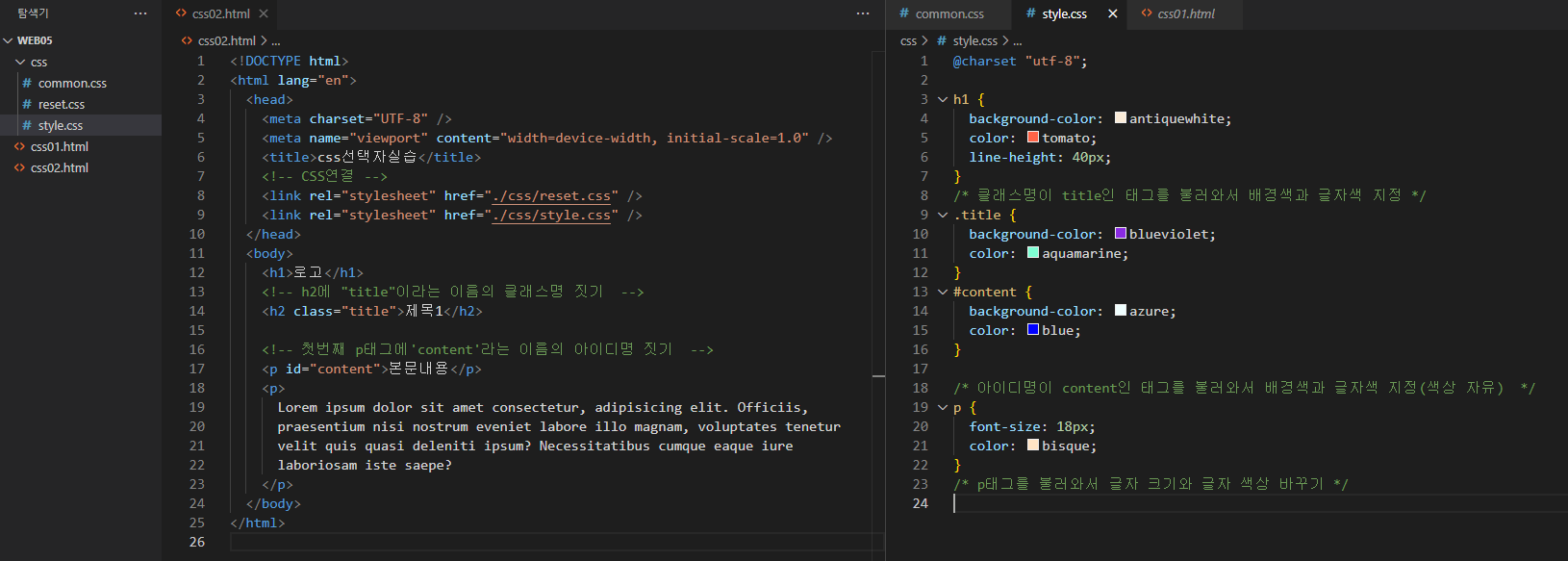 2. 클래스 선택자 (CSS에서 .클래스명 형식을 사용하여 태그 불러오기) : 태그 안에 class라는 속성을 선언하여 해당 클래스명을 가지고 있는 특정 태그에 스타일을 적용하는 선택자. id선택자와는 달리 선언한 이름을 다른 태그와도 여러 번 공유하며 쓸 수 있다. (동일한 클래스명을 가지고 있는 태그들에 디자인 스타일을 한 번에 적용할 수 있어 가장 많이 사용하는 선택자)